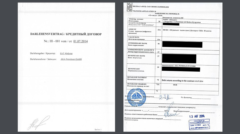 Саидмаҳдӣ (Саймати) қарордоди ба гуфтаи худаш суриеро дар ихтиёри хабарнигорон гузошт, ки тибқи он ширкати қирғизии ӯ, Абдироз, гӯиё 30 миллион доллар ба АКА Петролеум, як ширкати мутааллиқ ба хонаводаи Абдуқодир дар Олмон, қарз додааст. Ин қарордод, ки бар асоси қонунҳои Олмон ва ба таърихи 1-уми июли 2014 навишта шуда, муҳри расмии ширкати АКА Петролеум ва имзоеро дар бар дорад, ки ба имзои намояндаи Ҳабибуллоҳи Абдуқодир дар Мюнхен шабоҳат дорад.