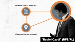 Ӯро молики ширкати "Пенкриҷ Глобал Лимитед" навиштаанд, ки гуё соли 2012 муфлис шудааст. Ширкат дар ҷазираҳои Вирҷинияи Бритониё сабт шудааст ва суроғаашро дар Тоҷикистон кӯчаи Фарҳод 36 дар Душанбе (36 Farkhod St; Dushanbe; Tajikistan) навиштаанд.